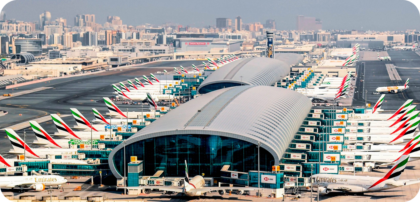 در شهر دبی، امارات متحده عربی، فرودگاه بینالمللی دبی (DXB) یکی از پرترافیکترین فرودگاههای جهان و قطب اصلی شرکتهای هواپیمایی امارات و فلایدبی است. سالانه بیش از ۹۲ میلیون مسافر از این فرودگاه عبور میکنند و روزانه هزاران پرواز به مقصد بیش از ۲۵۰ شهر داخلی و بینالمللی انجام میشود.