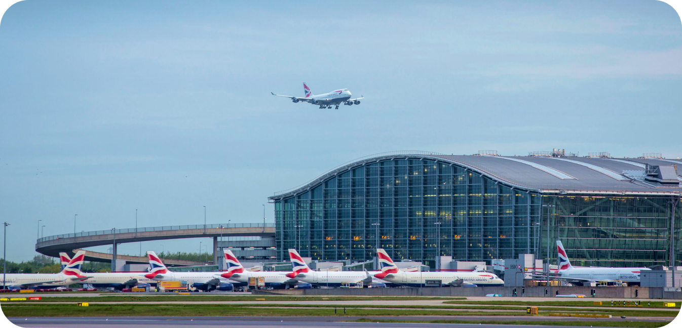 یکی از بزرگترین و پرترافیکترین فرودگاههای جهان، هیترو لندن در انگلستان قرار دارد و قطب اصلی پروازهای بینالمللی محسوب میشود. سالانه بیش از ۸۳ میلیون مسافر از این فرودگاه عبور میکنند و روزانه هزاران پرواز به بیش از ۱۸۰ مقصد داخلی و خارجی انجام میشود.